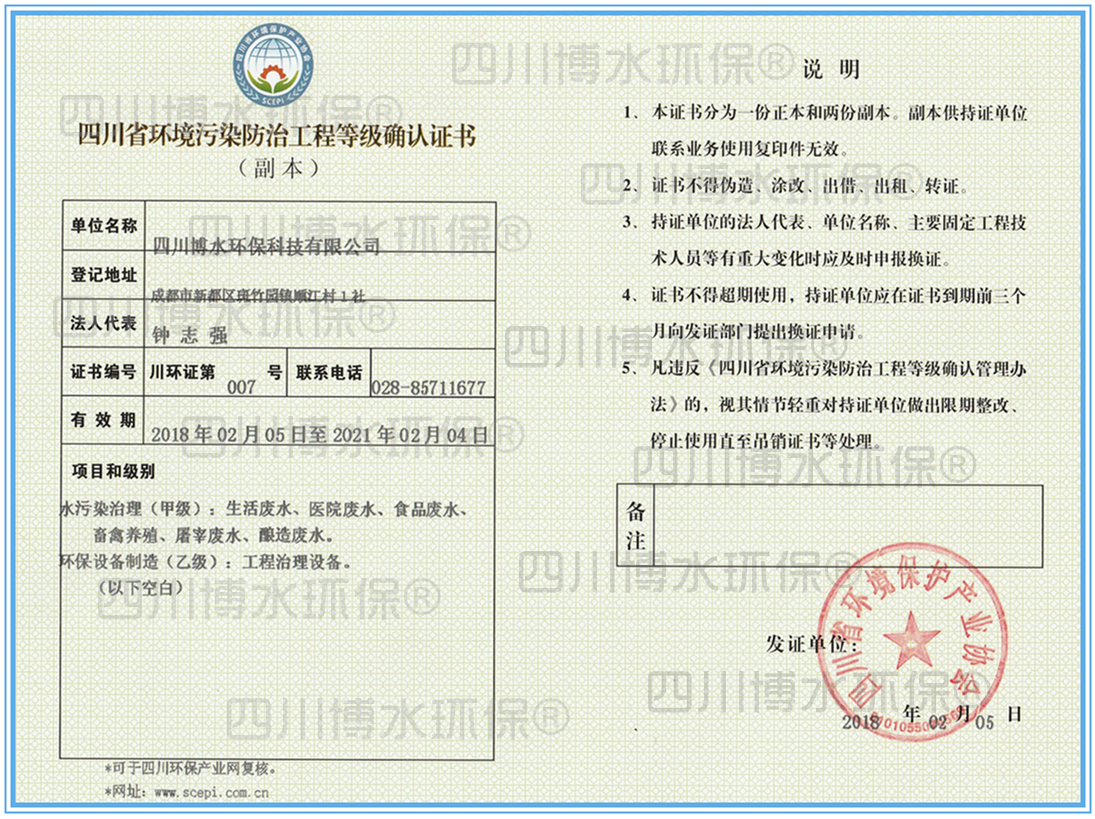 博水环保荣获水污染处理甲级证书