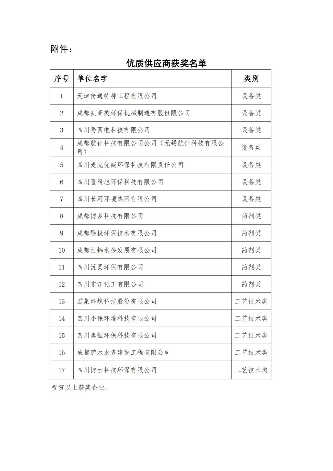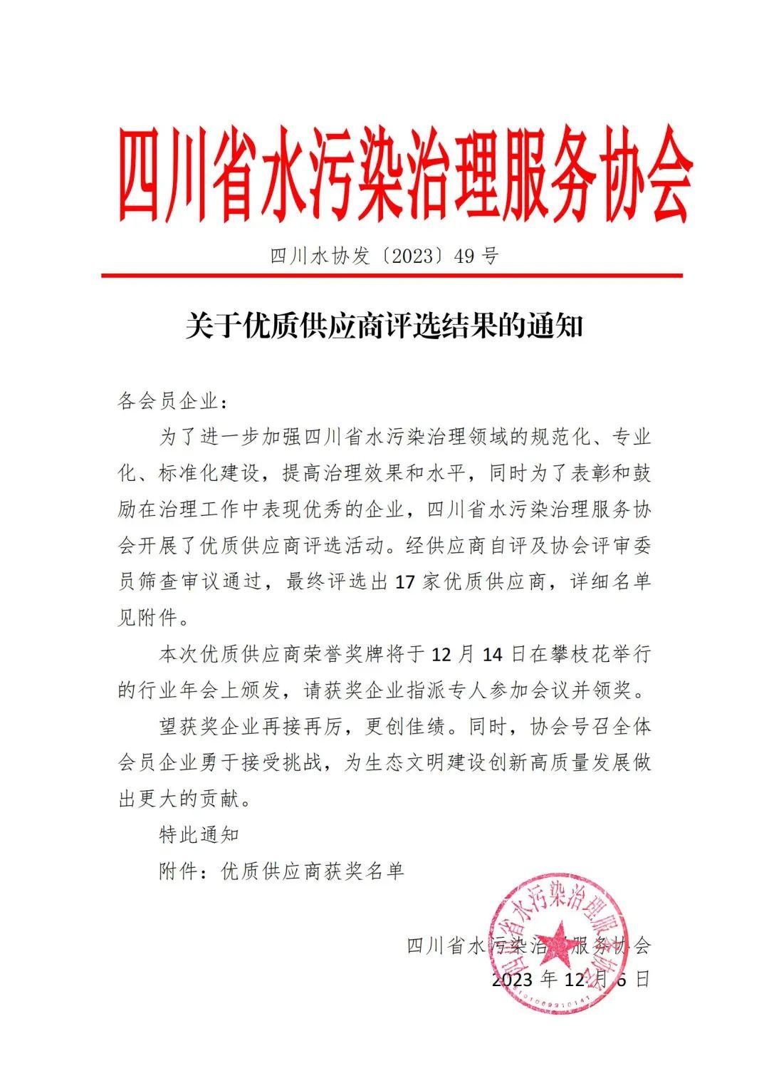 四川省水污染治理服务协会评选出的17家优质供应商中,有幸看到了我们的名字!