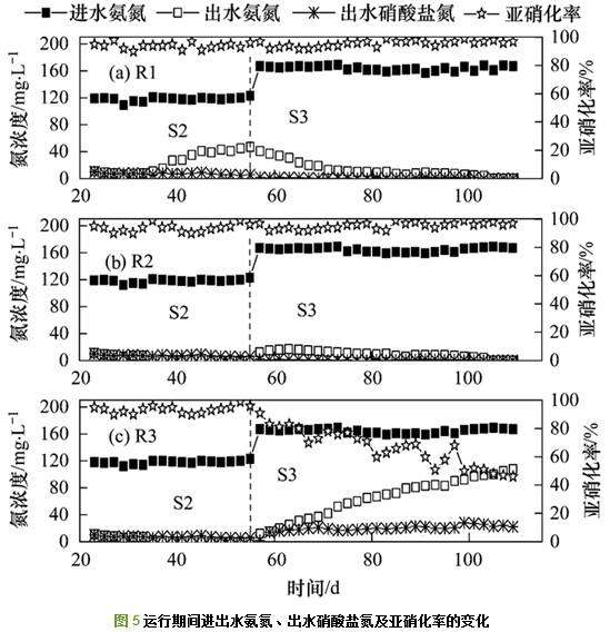 实验分为S1、S2、S3这3个阶段:S1阶段为亚硝化阶段, 采用低碳氮比的人工配水启动亚硝化; S2阶段为亚硝化污泥颗粒化阶段, 通过在R2、R3反应器中分别添加20%的好氧颗粒污泥、20%除磷颗粒污泥以期加快颗粒化进程; S3阶段为强化颗粒化阶段, 通过增加进水中的COD负荷和氨氮负荷, 促使亚硝化颗粒增大和提高系统的亚硝化性能.