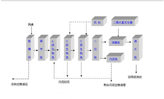 废水经隔油池隔除大部分浮油及剩饭残渣,进入调节池,在调节池内均质、均量后经泵提升至A级生物池,在A级生物池段异养菌将污水中可溶性有机物水解为有机酸,使大分子有机物分解为小分子有机物,不溶性的有机物转化成可溶性有机物,将蛋白质、脂肪等污染物进行氨化。在O级生物池段存在好氧微生物及消化菌,其中好氧微生物将有机物分解成CO2和H2O;在充足供氧条件下,硝化菌的硝化作用将NH3-N氧化为NO3-,通过回流控制返回至A级生物池,在缺氧条件下,异氧菌的反硝化作用将NO3-还原为分子态氮,接触氧化池出水自流进入沉淀池进行沉淀,沉淀池上清液出水进入清水池短暂停留,出水达标排放。