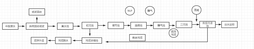 中段废水预处理由斜网过滤、初沉池以及调节池等组成。本工艺中采用斜网代替常规的格栅来回收纸浆纤维,分离出的纸浆回用到造纸工艺中,废水则进入集水池,以潜污泵提升至沉淀池,进步一去除废水残留的纸浆纤维等悬浮物。初级沉淀池出水则自流进入调节池,均化水质、水量,减少对后续生物处理过程的冲击。