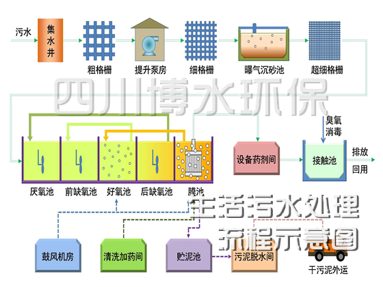 好氧池、MBR 膜组件、消毒设备、设备间等,配套设备包括风机、泵、