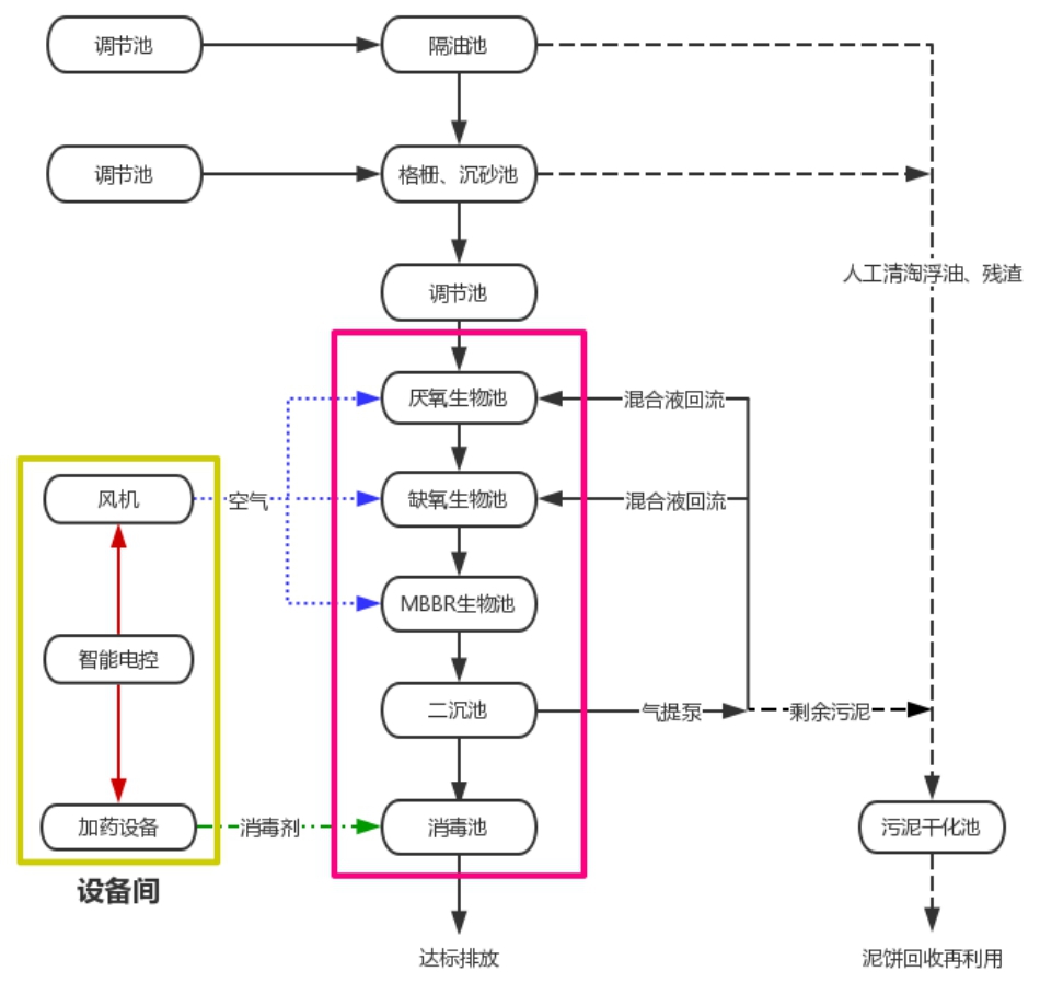 1 隔油池:厨房含油废水排入隔油池,对污水进行隔油预处理,有助于后续处理工艺的正常运行;